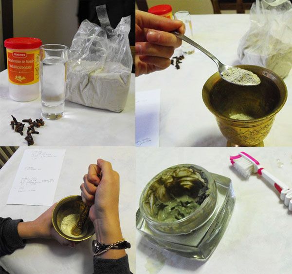 Prenez une pâte de base : 100 g d’argile verte surfine (en magasins diététiques, herboristeries). Ajoutez de l’eau en quantité suffisante, jusqu'à l’obtention d’une consistance pâteuse. Incorporez 10 g de charbon végétal, une cuillère à soupe de vinaigre de cidre ou de jus de citron, 5 g de sel marin fin, une cuillère à soupe d’extrait fluide hydroalcoolique de plantain, 5 g de savon à l'huile d'olive que vous aurez râpé, 2 g de clou de girofle en poudre et 30 à 50 gouttes d’huile essentielle de romarin, par exemple, pour l’arôme mais aussi pour tonifier.